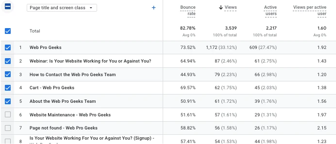 Here, we can get more detailed information about the page visits and compare data. For example, our new Webinar page gets more traffic and users than our Website Maintenance Services page. However, the Website Maintenance Services page earns more events; meaning people click on and engage with the content more on that page.