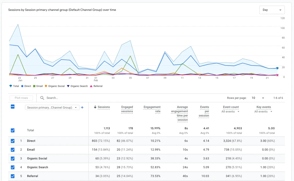 This screen provides more details. For example, we can see that organic social traffic and organic search traffic account for only 10% of the total traffic. Direct traffic is most effective at 72%, followed by email with 13%. In our strategy, we can try to put more effort into earning organic traffic.